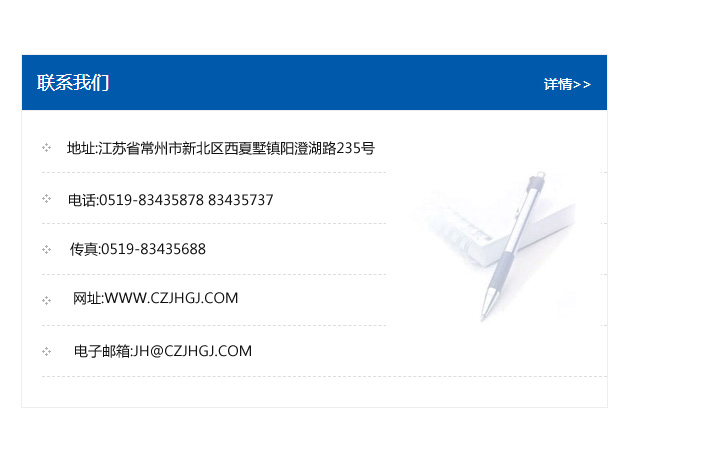 地址:常州市新北區友邦商務大廈1幢16、17層  電話:0519-85101652  傳真:0519-85112595  郵編:213022  網址:www.cz-jiayue_cn.lhhphg.com  郵箱:xiajifengaa@163.com
